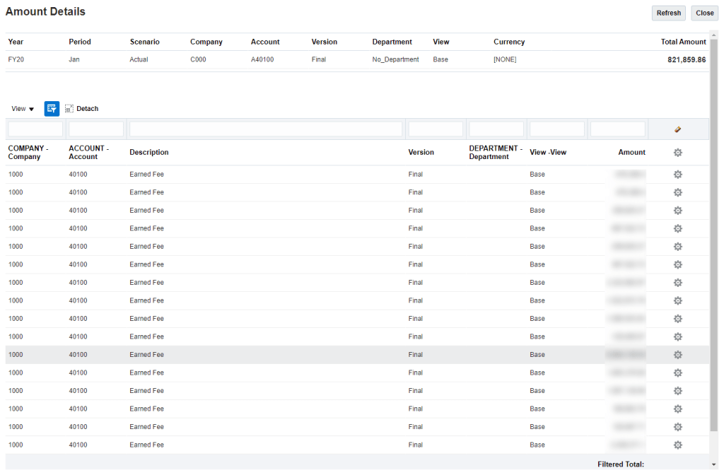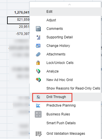 Some additional functions are available from the Gear icon on each line. Drill-through is available in Smart View as well and functions similarly.