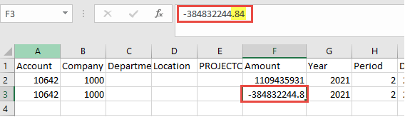 To prove out my theory, I opened each of the original export files from the GL in Notepad++ and did the merge to one file there. The file was saved as CSV. Notice the values.