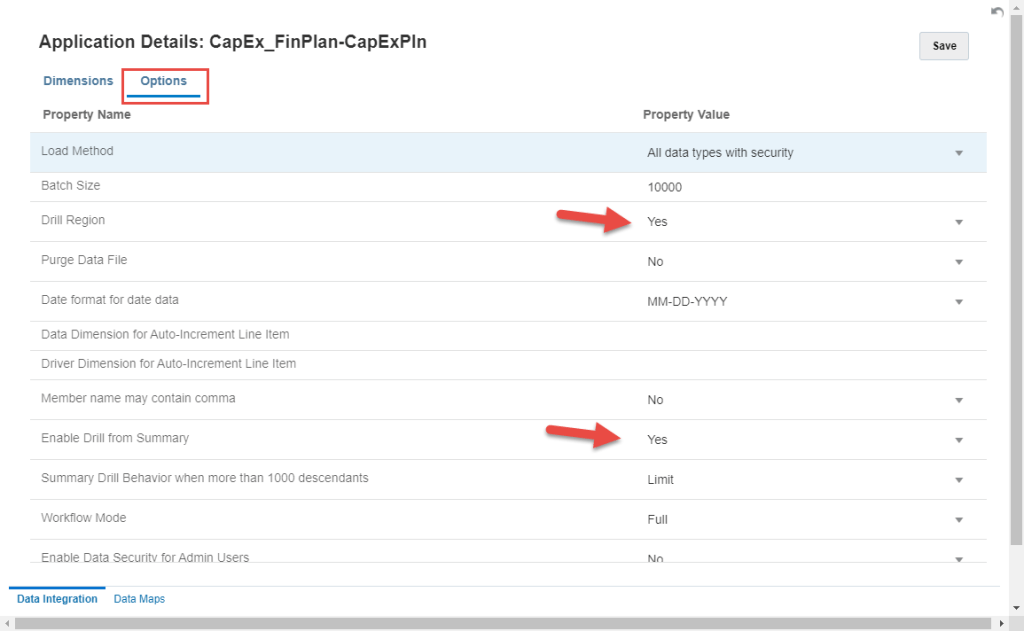We wanted drill-through, so we were about to do what had been done previously to set up the target application.  But we wanted to understand the Enable Drill From Summary functionality.  Google returned much of the same information as the last time, but there was some new information in the results.  This new information was enlightening.  Instead of enabling specific dimensions, our new understanding was that all we had to do was check “Yes” on Drill Region and Enable Drill From Summary.  This is done from the Options tab.  By not selecting individual dimensions, the drill region definition will use the default dimensions of scenario, version, period, and year.