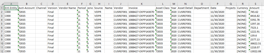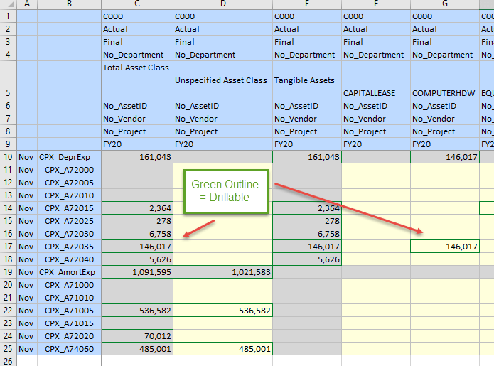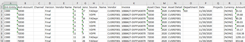 The next steps were standard tasks to create the Import Format, Location, and Load Rule.  Once that was done, we were ready to test.  The load ran successfully.  A Smart View ad hoc was set up to view the data.  Green outlines on the cells indicate the data is drillable.  Both level 0 and summary level cells are drillable.