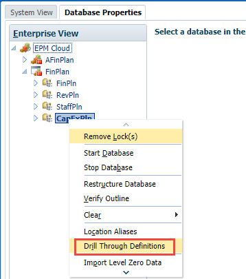 A successful integration with drill-through enabled for both level 0 and summary level data is almost complete.  There is one last step to do.  Remember that we did not select individual dimensions for the drill region, we wanted it to be created with the default dimensions.  In Calculation Manager, open the Database Properties and then the Drill Through Definitions.