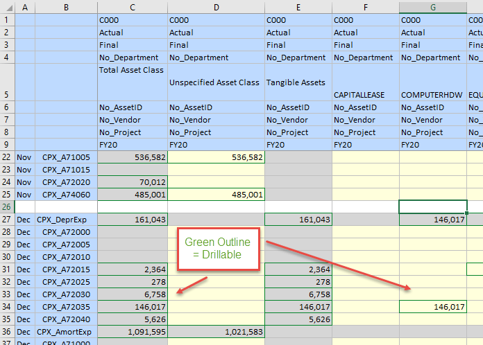 These changes to the target application are needed so the drill region definition is not changed with each load.  Now we will load another period to test that it is drillable.  We added Dec to our ad hoc and loaded the same data.  Looks good so far, green outlines on the cells indicate drill-through is available.