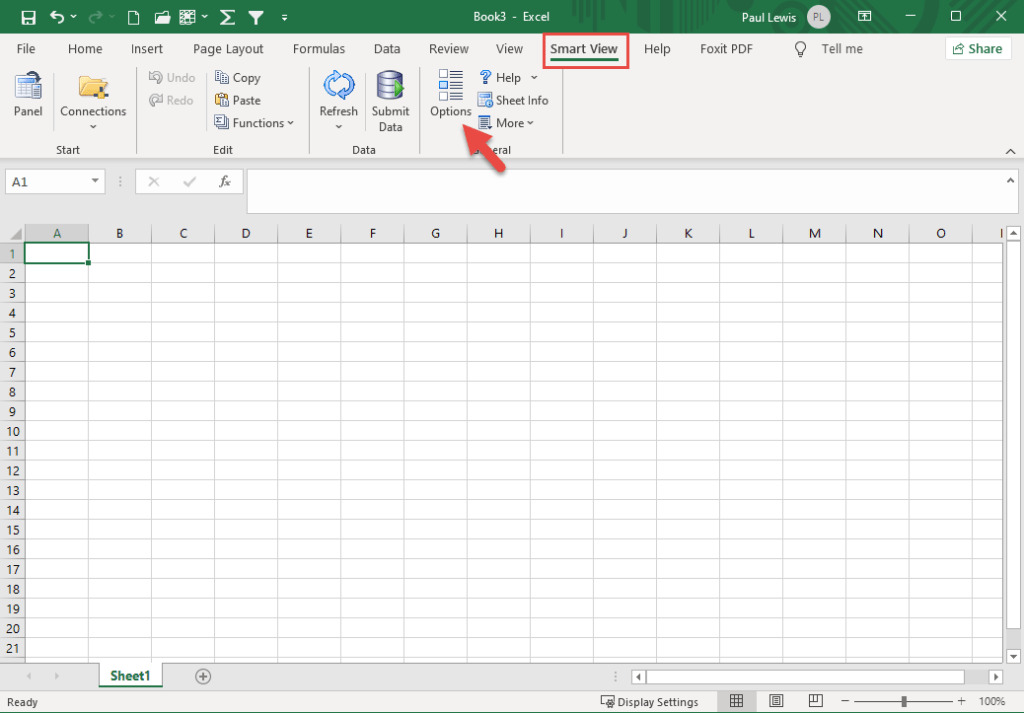 Before we can look at the functionality of books in Excel, we have to install the extension in Smart View. Open a new Excel workbook and login to a Cloud EPM environment. From the Smart View ribbon, open Options.
