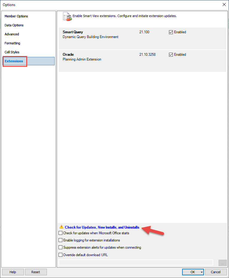 From the Options window, go to the Extensions tab and click on the Check for Updates hyperlink.