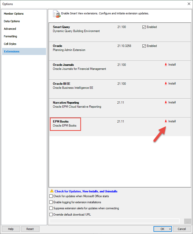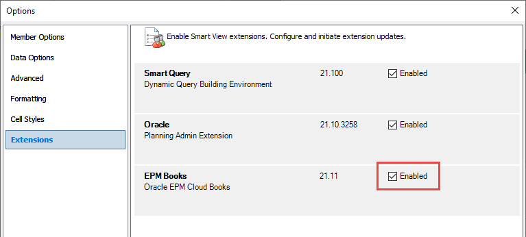 Restart Office if prompted and reopen Excel. From Smart View Options > Extensions, the EPM Books extension should now show as enabled.