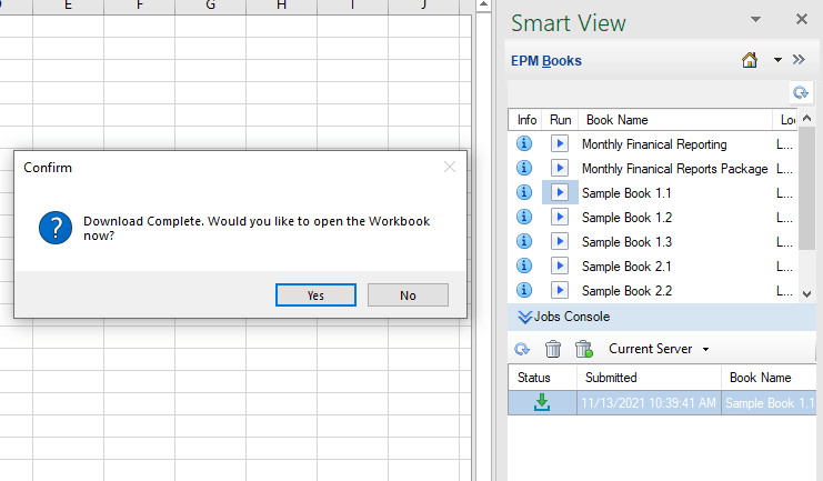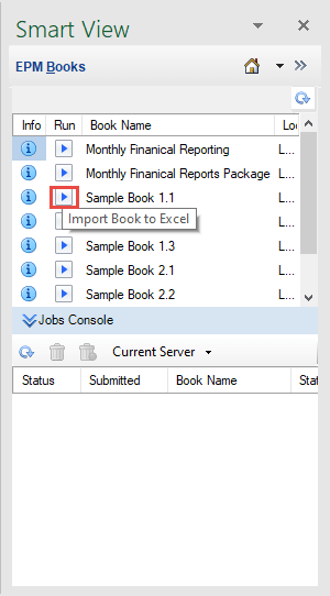 It would seem EPM Books functionality has a bug. Or does it? Going back to the Smart View ribbon, we open Panel and refresh the Jobs Console. There are now 3 books available.
