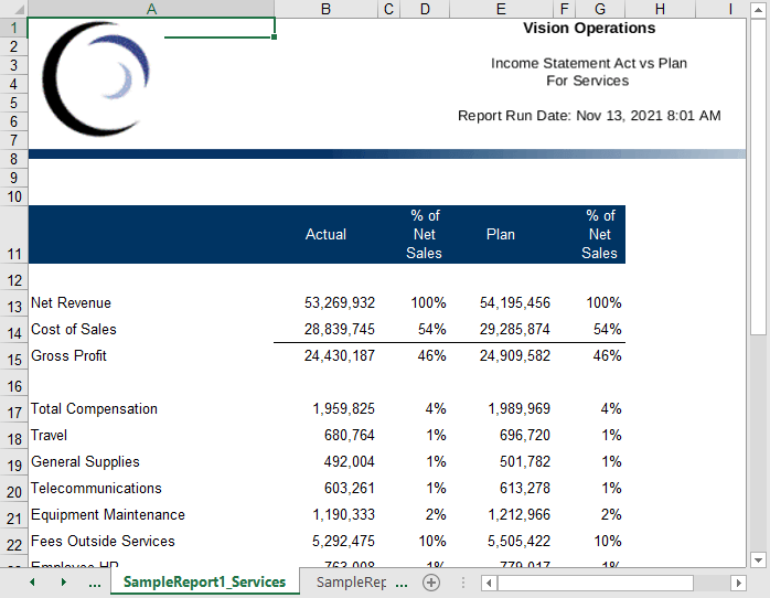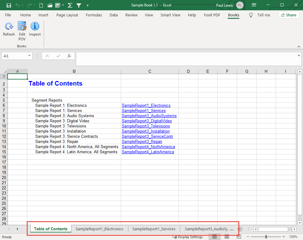 A new Excel workbook opens. The first tab is a table of contents, and each report in the book has a tab in the workbook.