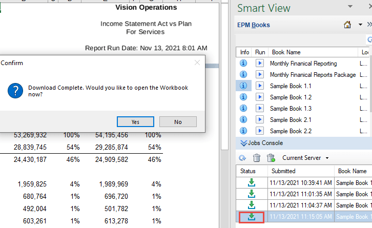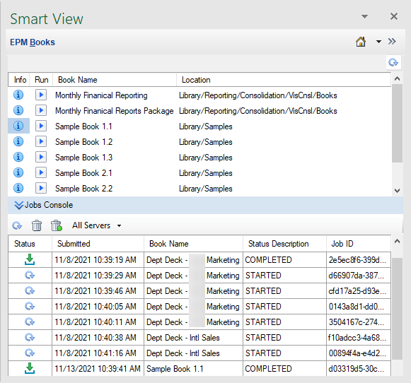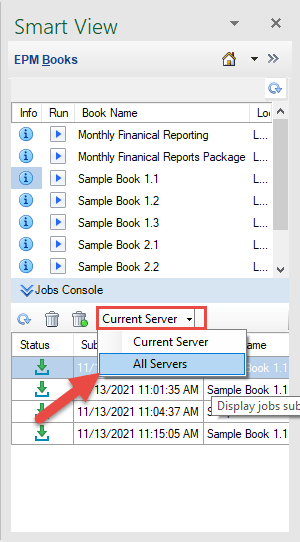 The Jobs Console not only lists the current EPM connection books, you can also access books from other connections that had been run. Select All Servers from the drop-down.