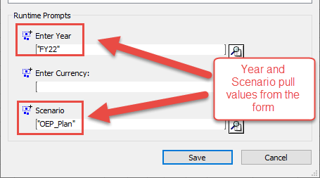Year and Scenario populate with the values from the form, but Currency does not because it is in the rows.