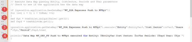 operation.application.getDataMap("WF_SGA Expenses Push to WFRpt").execute("Entity":EntityVar3,"Cost Centre":ccVar3,"Years":fyr,"Period":fspd,true)