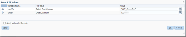- Define variables for the entity and cost centre dimensions. These variables will be referenced along with the RTPS variables.