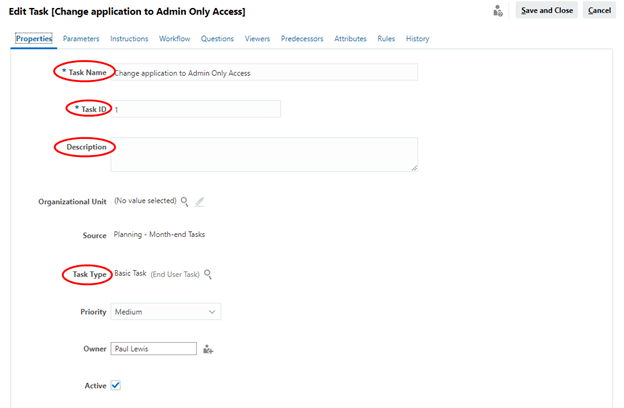 - Properties is where you set the task name, ID, description, and the type of task. For Task ID, I like to use a numbering system to help keep the list organized.