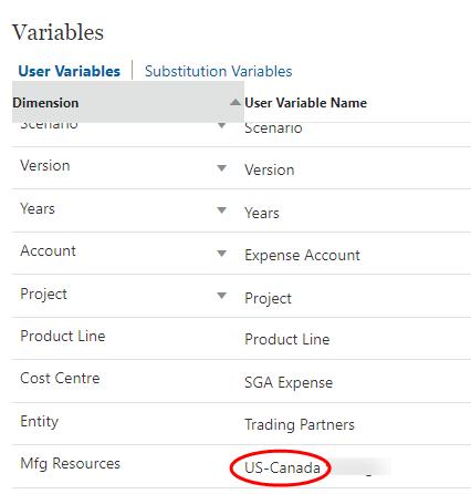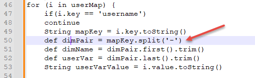 The error is stating that the variable “Canada” does not exist. That’s true since the variable created is named “US-Canada”. Looking more closely at the line we can see that the character between the dimension name and the variable name is also a “-“. Further down in the script where the mapping is defined, we see that the “-“ character was defined as the split character.