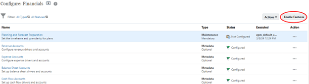 If Financials was already enabled, you will see the existing configuration pieces. Select Enable Features to go back and update the configuration. If Financials was not already enabled, the Enable Features page will open first.