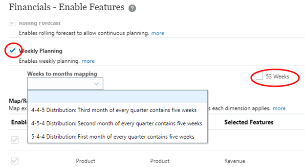 This brings up a drop-down menu for the weeks to months mapping. We are going to select 4-4-5, and we are also going to select 53 Weeks which will open more options.