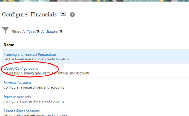 After the enablement is complete you will need to log off and sign back into the application. Go back to Configure: Financials. Notice that the configuration pieces have changed, there is now Weekly Configurations.