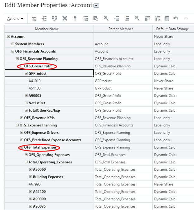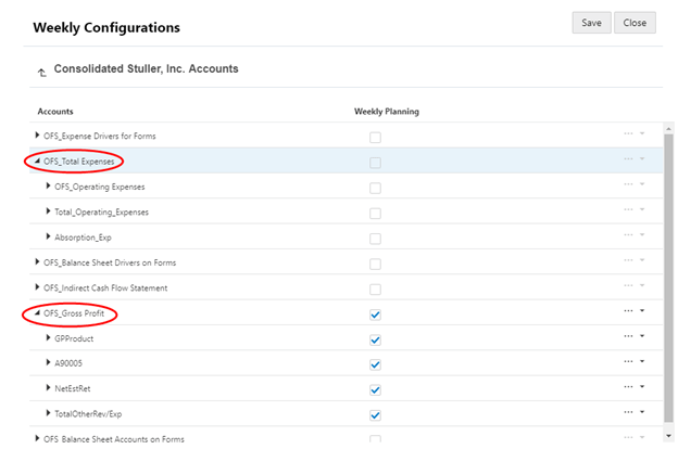Before we go into that, there are some other things to do. For weekly planning configuration to work, either the out-of-box (OOB) accounts need to be used, or bring-your-own accounts need to be incorporated into the OOB hierarchies. We have a custom chart of accounts, so we need to set up those accounts in the proper OOB hierarchies. Our revenue accounts are placed under OFS_Gross Profit and our expense accounts are placed under OFS_Total Expenses.
