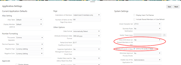 A couple of settings need to be changed to make this work. Go to Settings and change “Allow Drill Down on Shared Members in Ad Hoc” to Yes, and click the check box on “Drill to All Levels in Base” to enable.