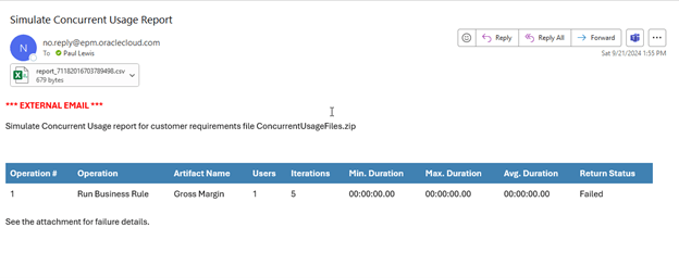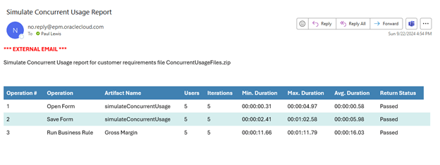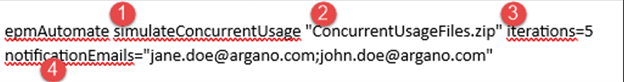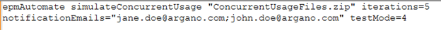 call epmAutomate simulateConcurrentUsage "ConcurrentUsageFiles.zip" iterations=5 notificationEmails="jane.doe@argano.com;john.doe@argano.com" testMode=4