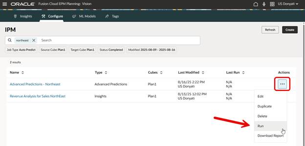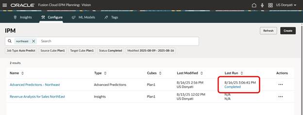 Confidence Intervals settings are interesting, and by “interesting” I mean it confused me a bit. If you enable Generate Confidence Intervals, Advanced Predictions will calculate additional scenarios for best case and worst case. In Auto Predict I often use versions for best and worst case, and in this sample application I do not have other scenarios created for this purpose. For this test run we will not enable Generate Confidence Intervals but may come back later after creating more scenarios and try again.