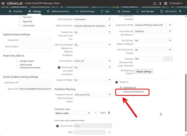 Before we can do anything, it must be enabled. This is opt-in functionality, EPM and legacy prediction functionality works fine without it, so if your company is not ready to embrace AI, that is ok. To enable, go to Settings and check the box.