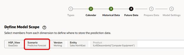 Moving on to the Future Data page, it looks the same as the Historical Data page, it carries over the selections made there. We need to change Scenario so our prediction is saved to the proper members. No other changes are needed here.