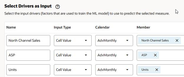 Next is Select Drivers as Input. This is what separates Advanced Predictions from standard predictions. The multiple drivers selected are going to impact the value of the prediction, meaning that the better the drivers, the better the prediction. You want to use drivers that make sense and have a correlation to the measure being predicted. In our example, average sales price and units do have a correlation to North Channel Sales, so they make sense as drivers. Note: There is the ability to select a different calendar, this can be used if you have a driver from a different cube or other variations where the needed data is not in the main calendar definitions.