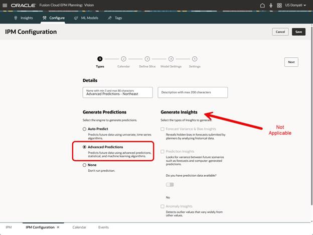The Types page has the option for Advanced Predictions. When selected, notice that the Insights options are not available. This is different than when standard Auto Predict is selected.