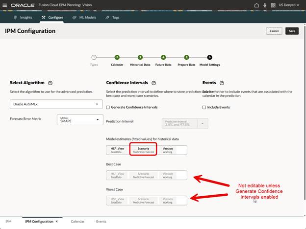We do need to select where the model estimates prediction data will be stored, the default prepopulates with Actual, which does not make sense, and the configuration will not save with that as the selection. We changed it to Predictive Forecast. Also note that Best Case and Worst Case are not editable since we did not enable Generate Confidence Intervals. Events can be included, just like in Auto Predict, but we do not have any to use in this test.