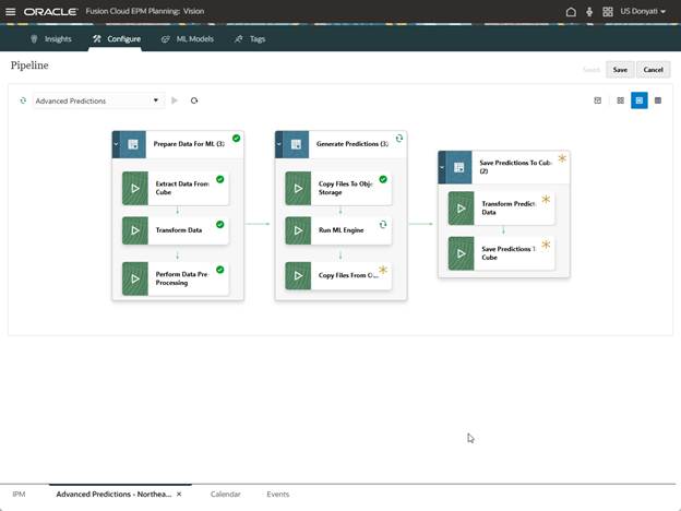 It may take a while to complete. Behind the scenes several things are happening. When we created this Advanced Prediction, a Pipeline was generated. Stages to prepare the data for ML, generate predictions, and save predictions were created. The data is getting processed on Oracle AI servers and the results fed back to our application. We can track the status of the Pipeline for this prediction as it is running.