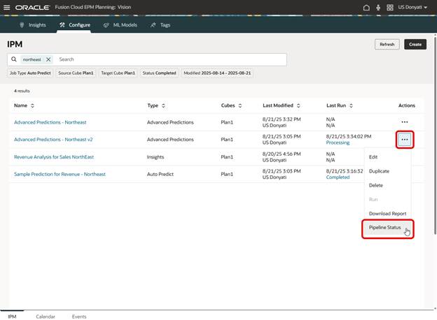 After launching the prediction, you can monitor the status of the job directly from the Configure page. From the ellipses, select Pipeline Status.