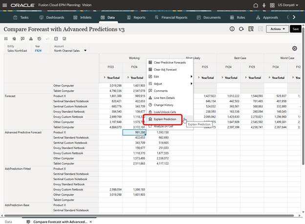 A feature I neglected to show in my first post on Advanced Predictions is Explain Prediction. This is only available on the web. Using the form we created to review the predictions, right click in a cell with predicted data and select Explain Prediction.