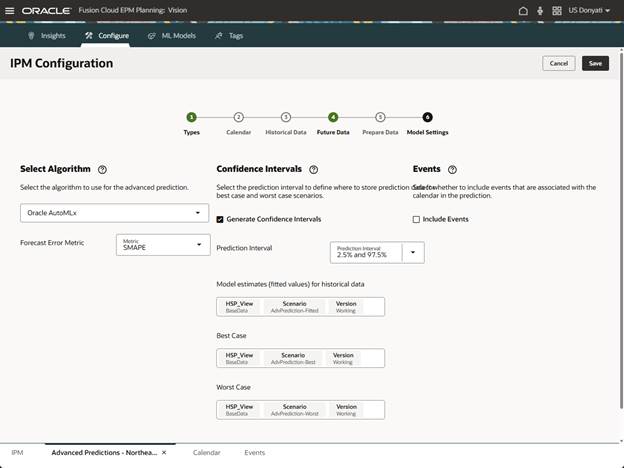 In Model Settings we enabled Generate Confidence Intervals and left the interval with default settings. This allowed us to select scenarios and versions for Best Case and Worst Case along with the selections for fitted values. The fitted values is still confusing to me, documentation doesn’t define what it is. I believe its purpose is to hold the historical data used for predictions, but I am not positive. Best and Worst were updated with scenarios we created for advanced best and advanced worst, and the version Working was used.