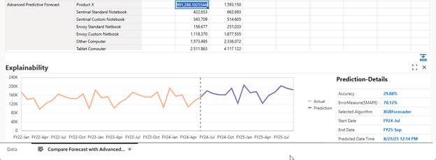 With the job successfully completed, we can now check the results. The predicted forecast looks ok initially; we will dig into the details by month to understand better how it differs from the univariate predictions. But the Best and Worst are not what we expected. The data is correct in the scenarios, but only one product was predicted.