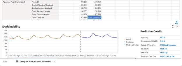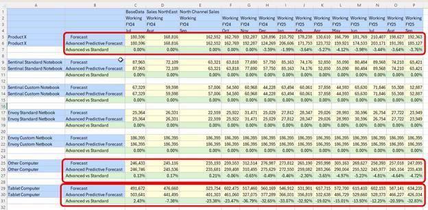 The results are interesting. Four of the seven products had no difference in forecast data between Auto Predict and Advanced Predictions. The three products with variances ranged from 0 up to 36%. Keep in mind that the data sample is small, this is not necessarily a useful comparison of methods.