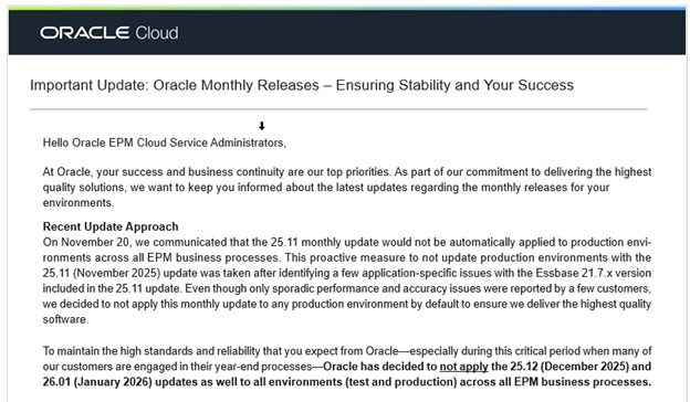Update to EPM Monthly Release: A few days ago, Oracle notified the EPM community that they were delaying the November (25.11) update to production environments. There had been a limited number of customers who experienced issues when the update went to their test environments, so Oracle decided to be extra cautious until they could resolve those issues. They have now decided to skip the December (25.12) and January (26.01) updates to all environments across all business processes.